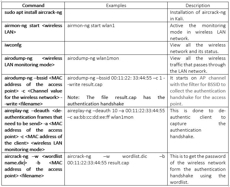 This tool is basically used in the wireless network hacking and the steps involved in the same are explained in the table below: