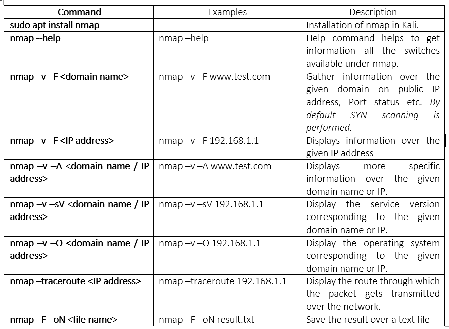 In this section, basic commands that can be used with Nmap is listed below: